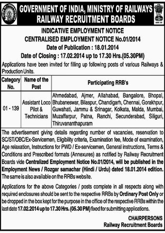 Railway Recruitment Board (RRB) has recently published a recruitment notification (Employment Notice No.01/2014) for the recruitment of 26570 various vacancies.