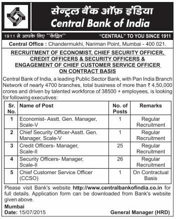 CBI recruitment 2015 :- Central Bank of India (CBI) has recently published a latest recruitment notification for the 54 posts of Economist,Chief Security Officer, Chief Customer Service Officer, Credit Security Officer – Asst. General Manager and Security Officers -Manager. Eligible and interested candidates must have post graduation as educational qualification according to the CBI Manager & Officer advertisements 2015, from any recognized Board/University/Institute of India and the selection process is based on the performance of personal interview according to the CBI Manager & Officer Notification 2015. Age Limit for applying for the recruitment is different to different by post wise.