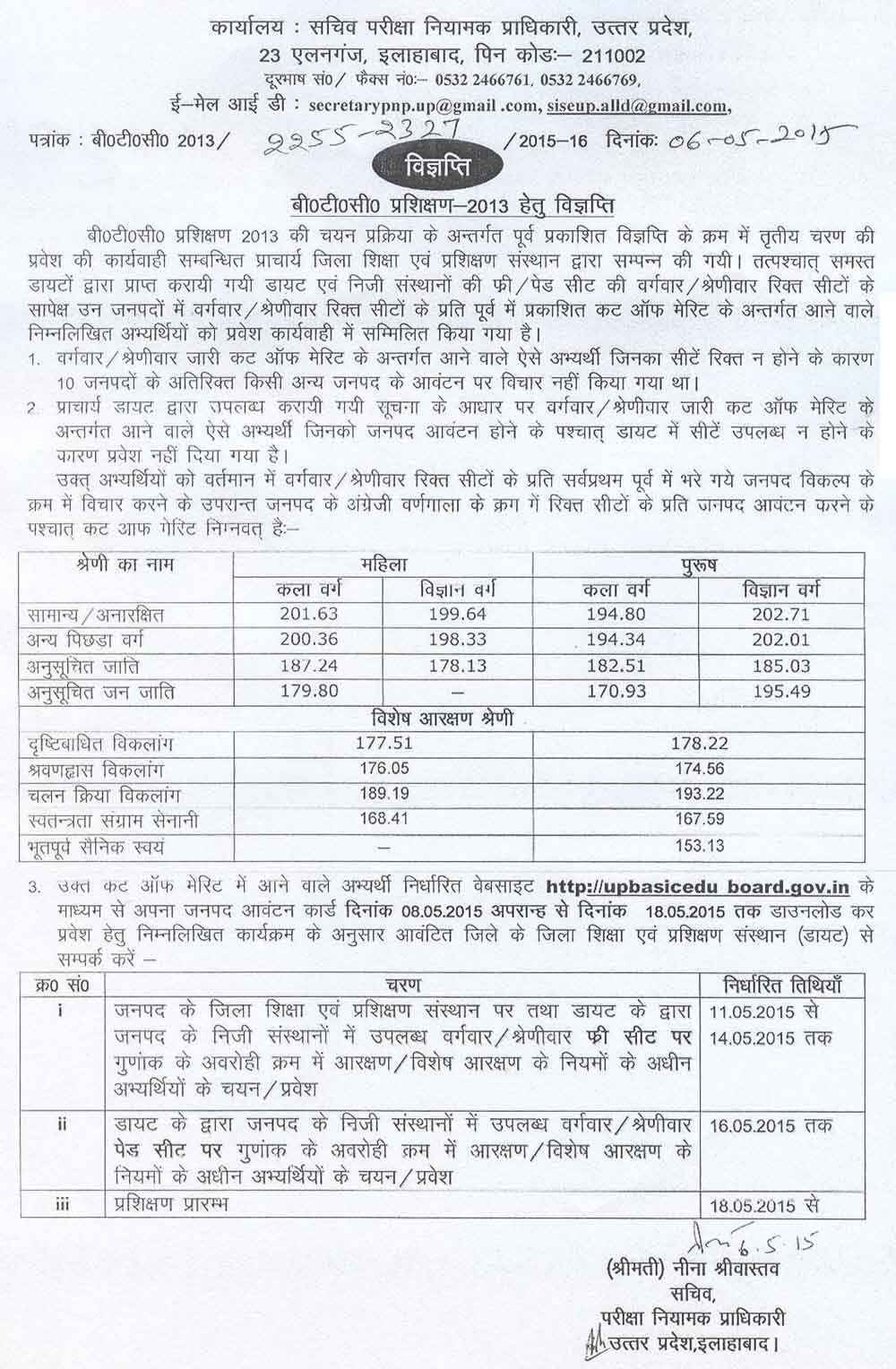 BTC-2013 4th counseling merit list and cut-off marks for male and female candidates has been released by SCERT and UP Basic Education Board on 6th May, 2015. Candidates are requested to download their District Allotment letter for official website http://upbasiceduboard.gov.in from 8th May, 2015 to 18-05-2015. After 18th May allotment letter will not be released further.