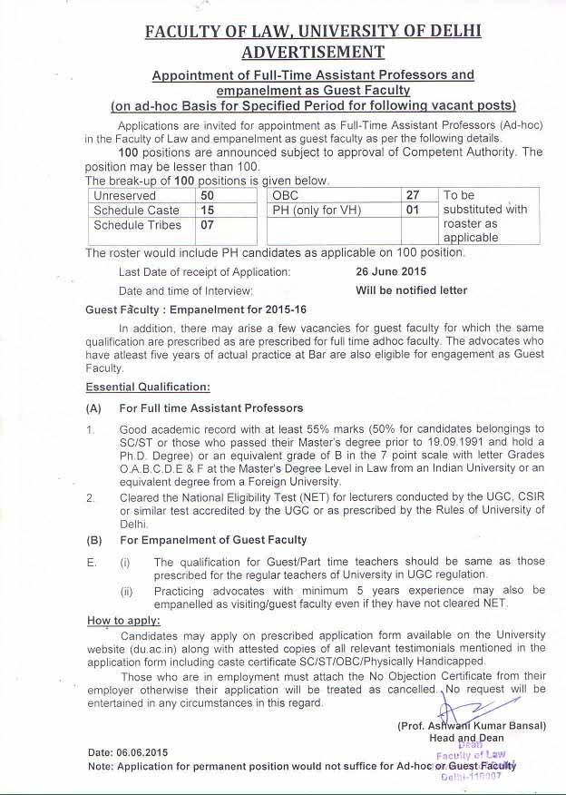 Delhi University Recruitment 2015 : Delhi University has published a notification for recruitment of 100 Full Time Assistant Officers on ad-hoc basis. Applications are invited for appointment as Full Time Assistant Professors (Ad-hoc) in the Faculty of Law and empanelment as guest faculty . Eligible candidates may apply in prescribed application format on or before 26-06-2015.