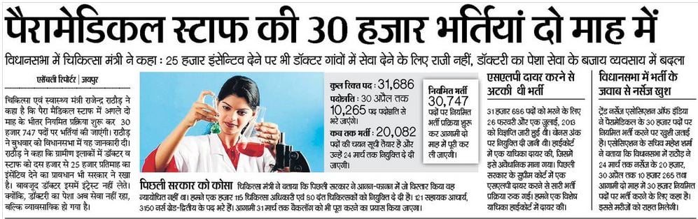 30147 NRHM Rajasthan Paramedical Staff Jobs Recruitment 2015: National Rural Health Mission (NRHM), Rajasthan Health Department has recently declared a notification for the recruitment of candidates in the Paramedical staff in the various departments. NRHM Rajasthan is going to filling up the 30147 Paramedical Staff Posts in NRHM Rajasthan. This recruitment notification is published by NRHM Rajasthan on it’s Official Website www.nrhmrajasthan.nic.in.