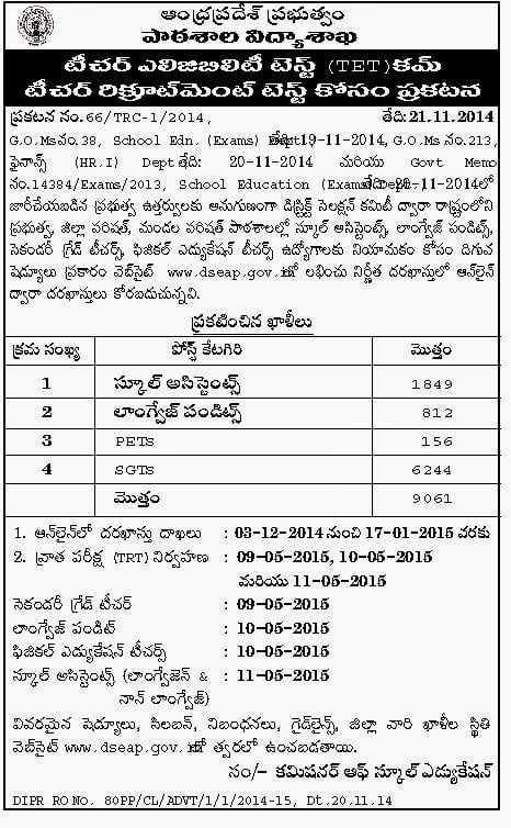 The AP TET cum TRT 2014-2015 Online Application will starts from 03rd December 2014 and the last date for the online application is 17th January 2015. For further details about this job vacancies like age limit, qualification, application fee, selection process and how to apply for this job vacancies are give below. You must check the full eligibility criteria for 9061 SGT, School Asst, LP & PET Jobs in AP TET/ TRT 2014 recruitment notification.