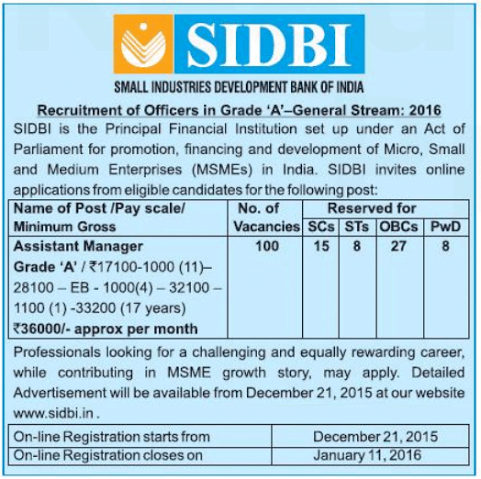 SIDBI Bank Jobs 2015 :- Small Industries Development Bank of India (SIDBI), has recently published a notification to fill up 100 posts of Assistant Manager by online through the official website http://sidbi.com. Process of online application form will be started from 21-Dec-2015 and the last date of submission of application form is 11-Jan-2016.